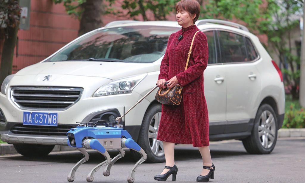 A visually impaired person tests an all-terrain smart guide dog in Chengdu, Southwest China's Sichuan Province on April 21, 2026. This robot navigates slopes, uneven roads, and stairs. Featuring HD voice interaction, it supports daily activities such as commuting, shopping, and hospital visits, empowering users with independence through advanced environmental perception and mobility. Photo: VCG
